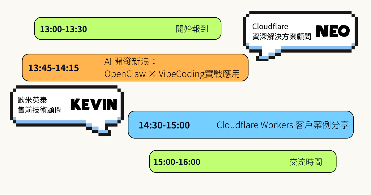 本次活動歐米英泰資深技術顧問將透過 Cloudflare Workers AI 實際開發案例,向各位分享如何在全球邊緣網路上快速建立 AI 應用。